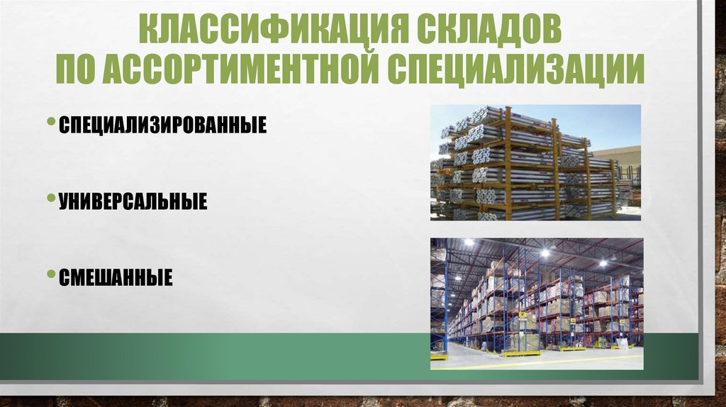 КЛАССИФИКАЦИЯ СКЛАДОВПО АССОРТИМЕНТНОЙ СПЕЦИАЛИЗАЦИИ