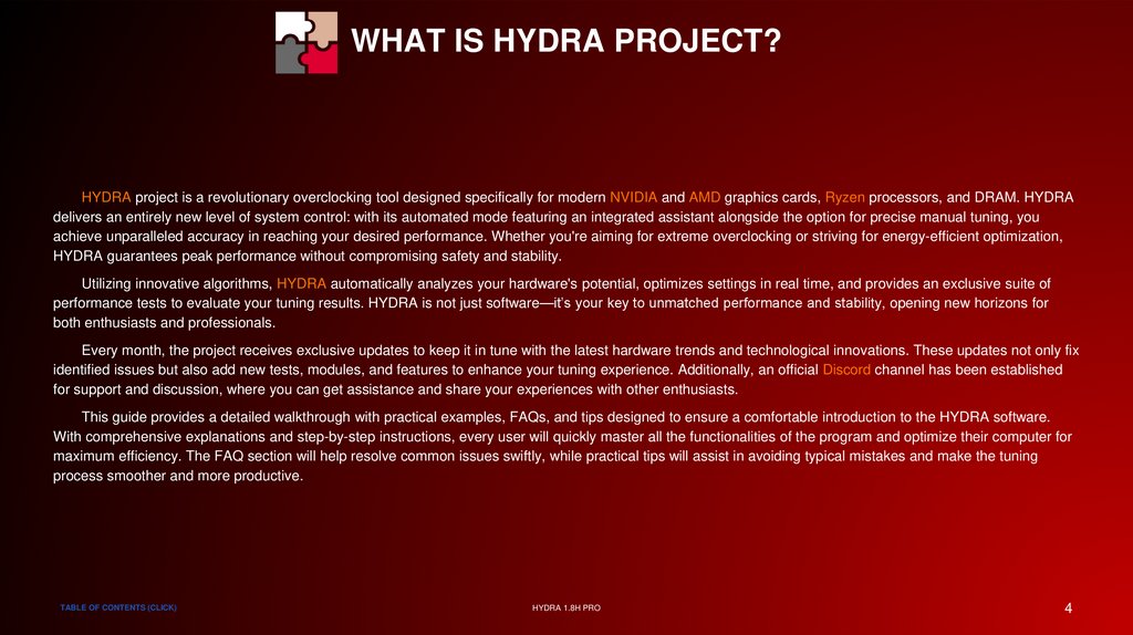 WHAT IS HYDRA PROJECT?HYDRA project is a revolutionary overclocking tool designed specifically for modern NVIDIA and AMD graphics cards, Ryzen processors, and DRAM. HYDRA