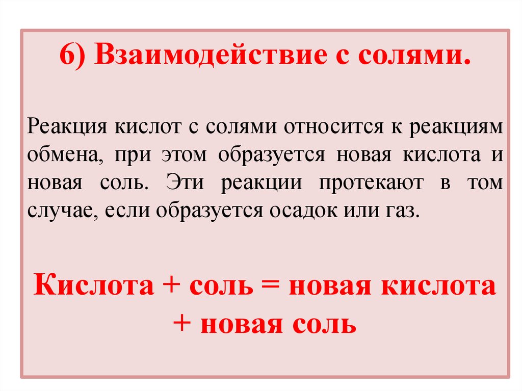 6) Взаимодействие с солями.Реакция кислот с солями относится к реакциям