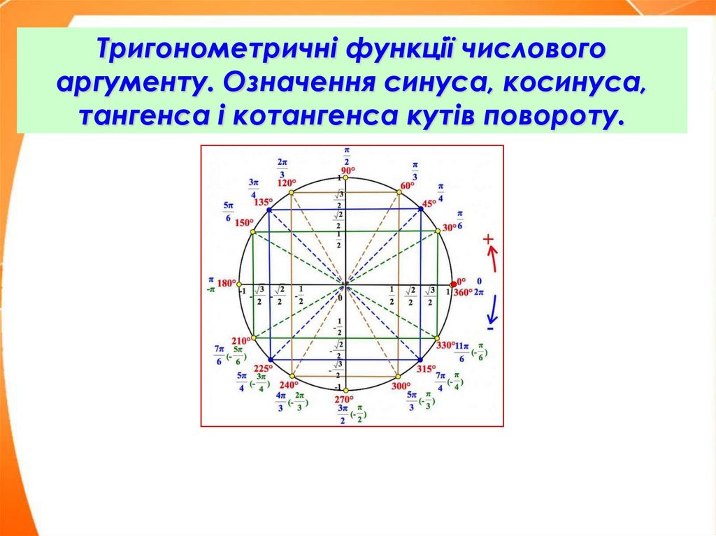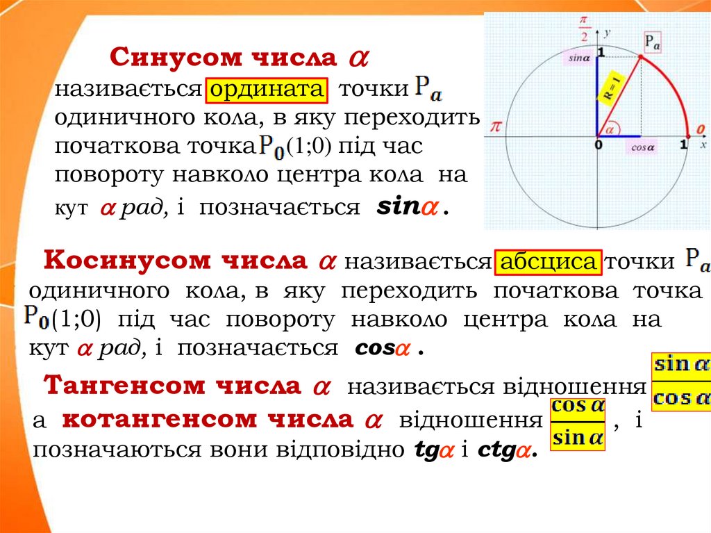 1. Тригонометричні функції числового аргументу. Означення синуса, косинуса, тангенса і котангенса кутів повороту.