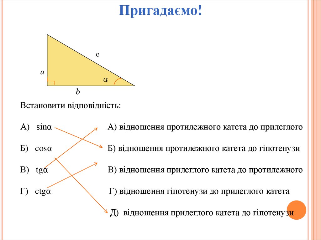 Д) відношення прилеглого катета до гіпотенузи