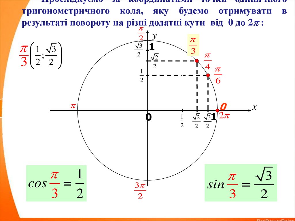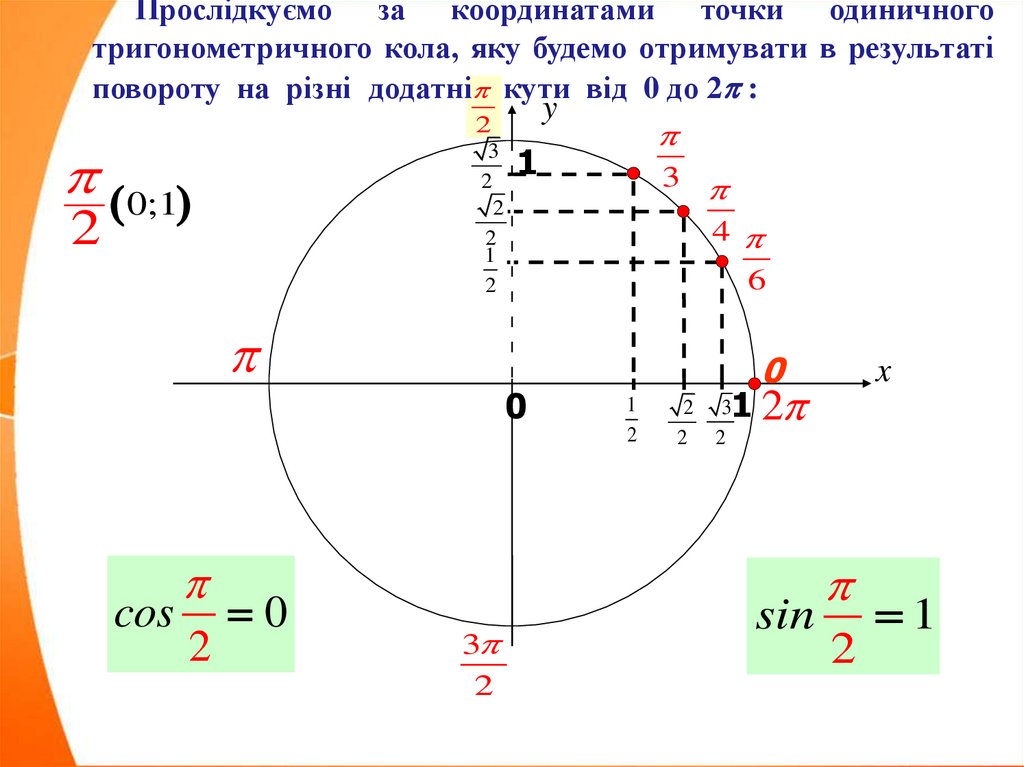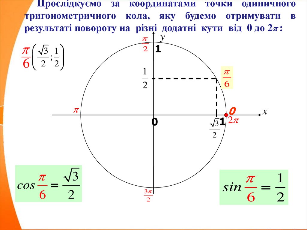 Прослідкуємо за координатами точки одиничноготригонометричного кола, яку будемо отримувати в