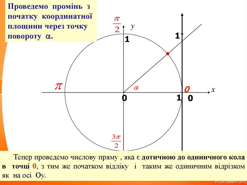 Тепер проведемо числову пряму , яка є дотичною до одиничного кола
