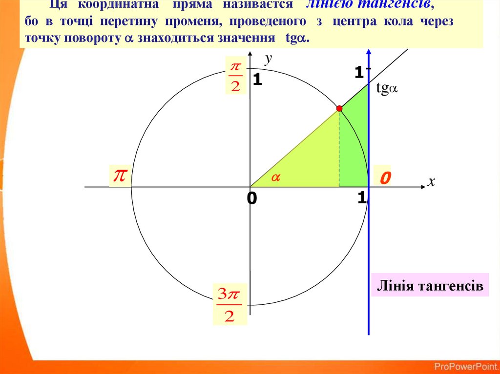Ця координатна пряма називаєтся лінією тангенсів,бо в точці перетину променя, проведеного з центра кола через