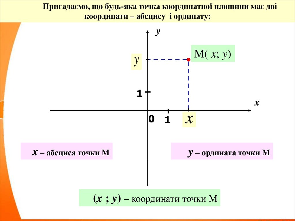 Пригадаємо, що будь-яка точка координатної площини має двікоординати – абсцису і ординату: