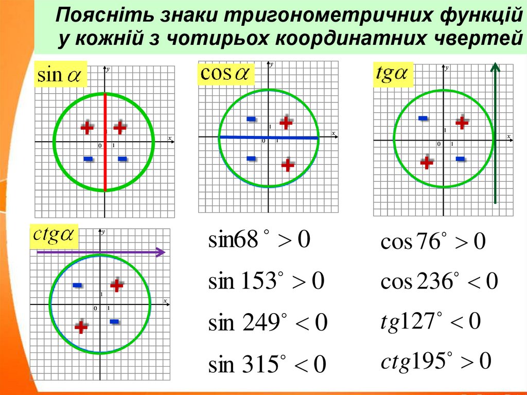 Поясніть знаки тригонометричних функційу кожній з чотирьох координатних чвертей