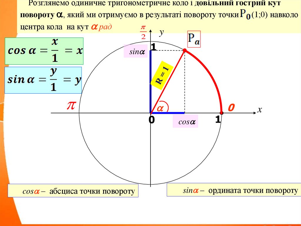 Розглянемо одиничне тригонометричне коло і довільний гострий кутповороту , який ми отримуємо в результаті повороту точки (1;0) навколо