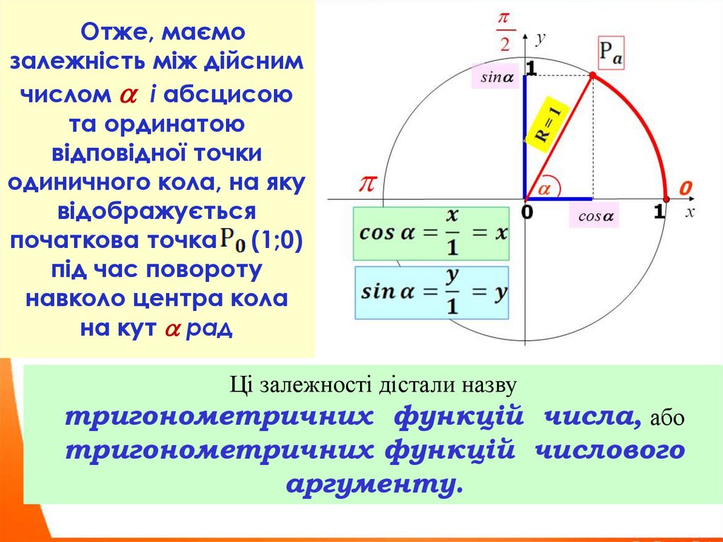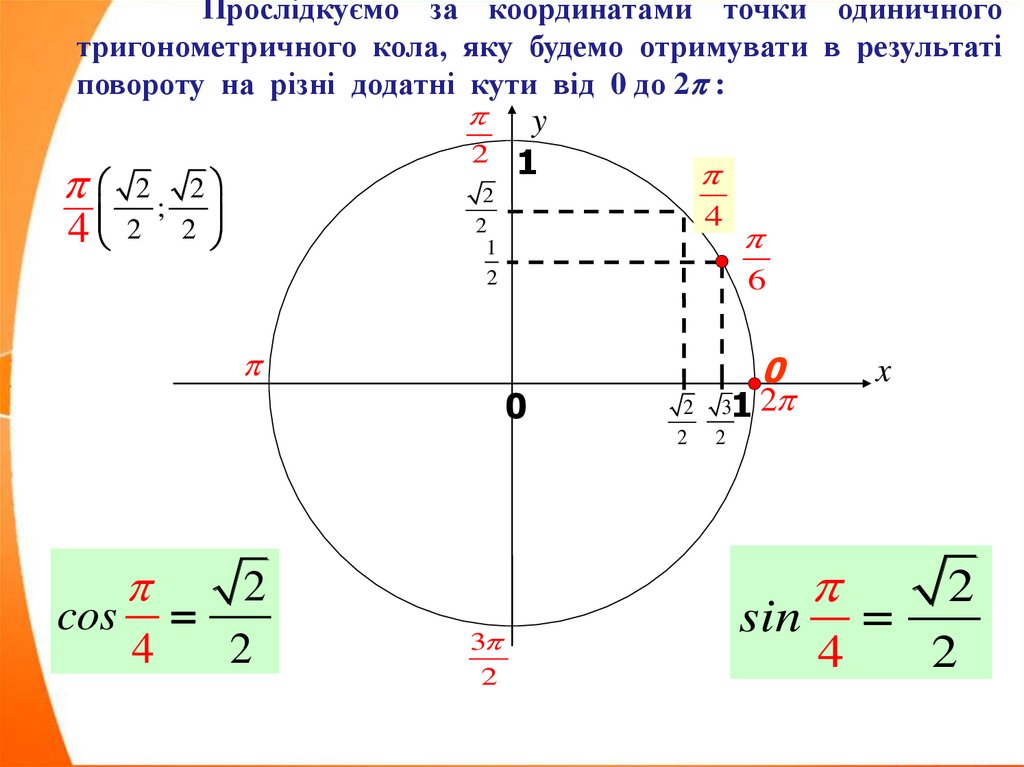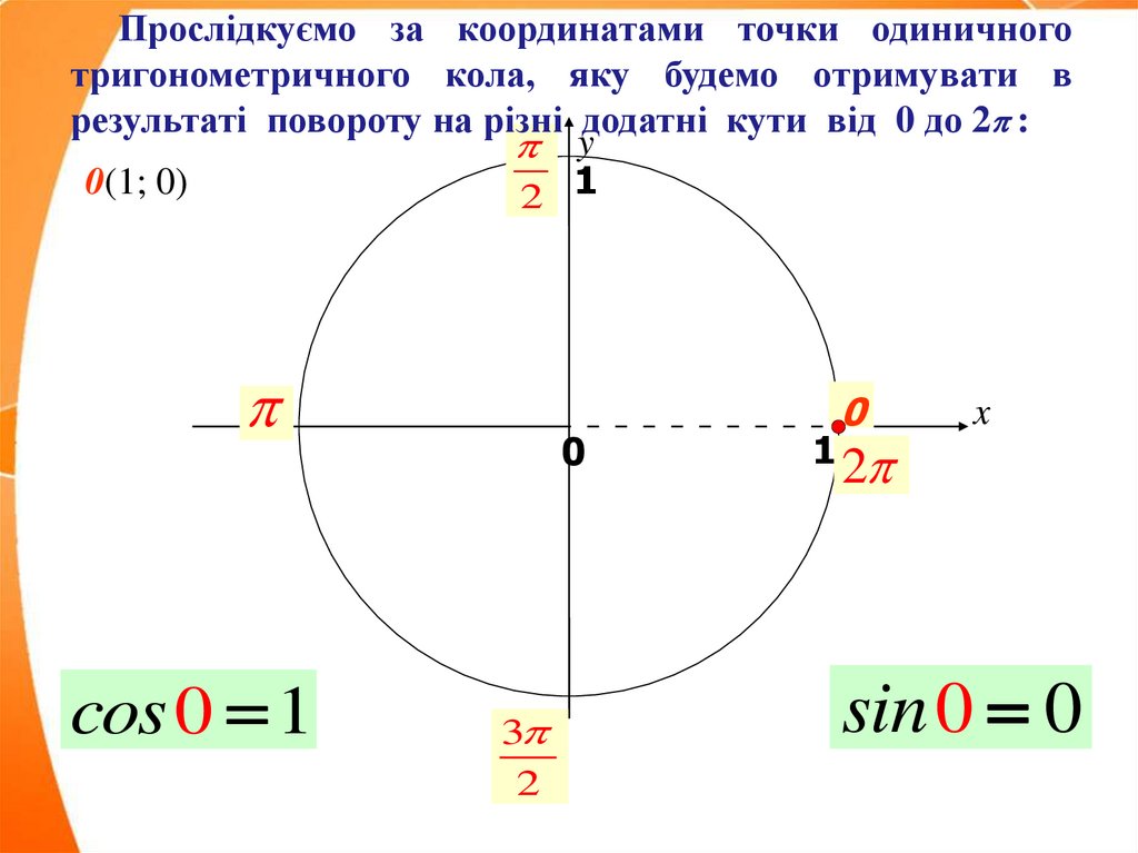 Прослідкуємо за координатами точки одиничноготригонометричного кола, яку будемо отримувати в результаті