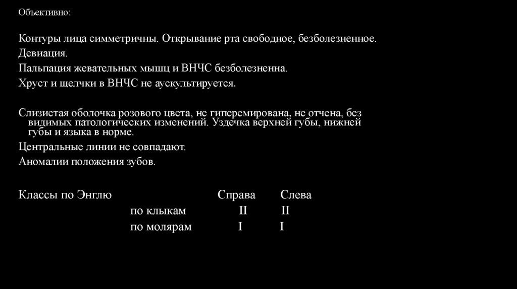 Объективно:Контуры лица симметричны. Открывание рта свободное, безболезненное.
