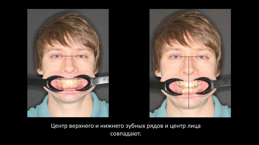 Центр верхнего и нижнего зубных рядов и центр лицасовпадают.