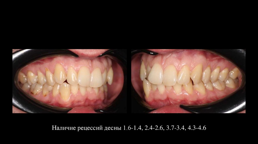 Наличие рецессий десны 1.6-1.4, 2.4-2.6, 3.7-3.4, 4.3-4.68.