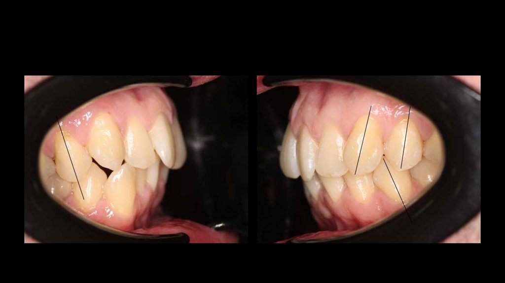 Избыточная небная инклинация жевательных зубов.Центры верхнего и нижнего зубных рядов совпадают.