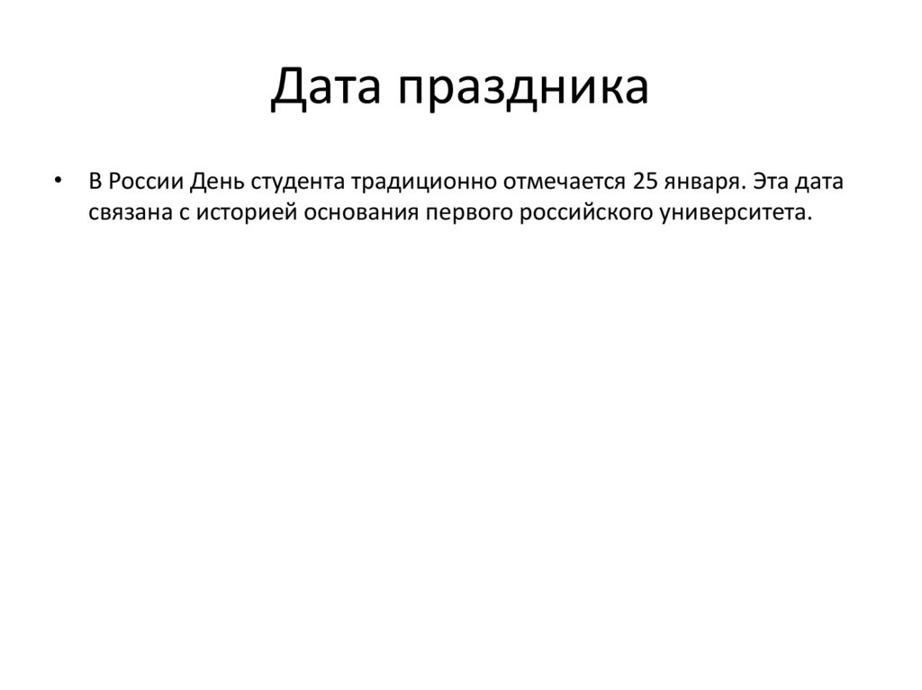 Дата праздника• В России День студента традиционно отмечается 25 января. Эта дата