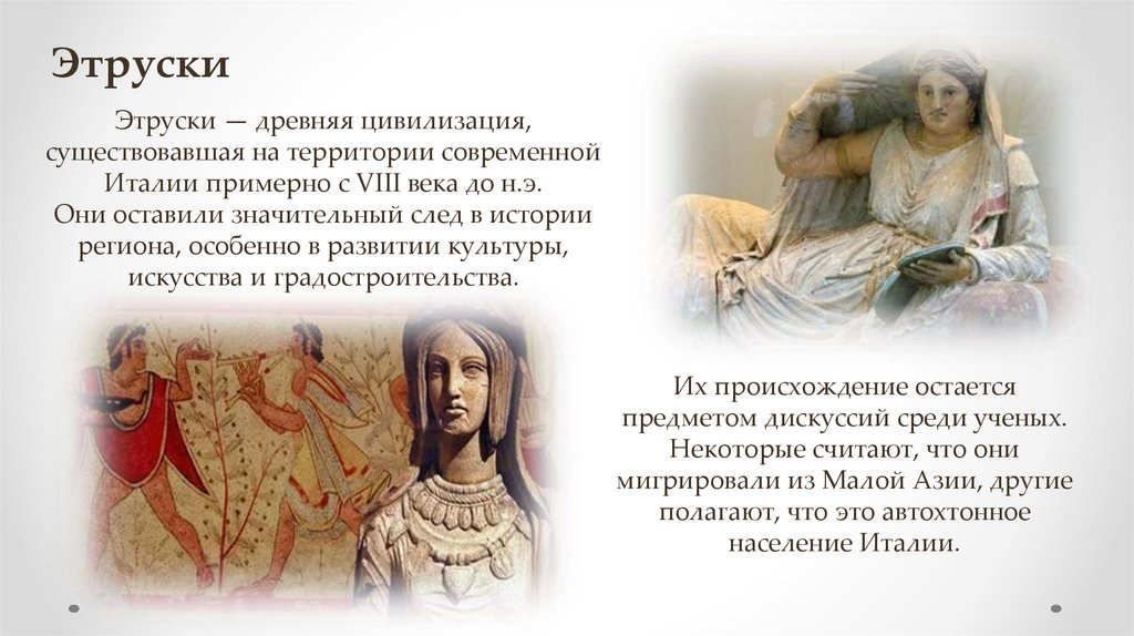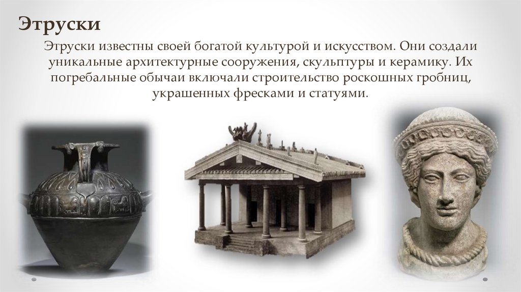 ЭтрускиЭтруски известны своей богатой культурой и искусством. Они создали
