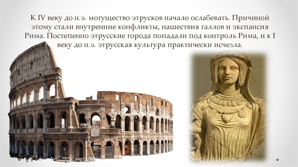 К IV веку до н.э. могущество этрусков начало ослабевать. Причинойэтому стали внутренние конфликты, нашествия галлов и экспансия