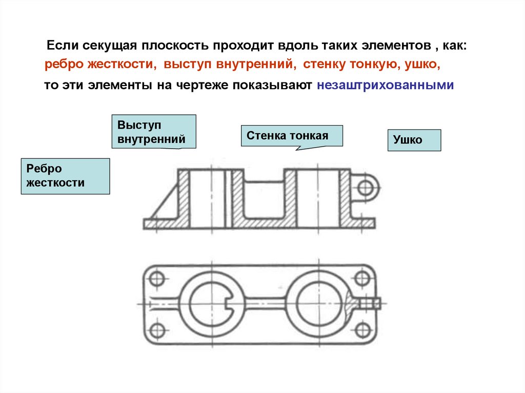 где сплошные части детали попали в секущую плоскость.