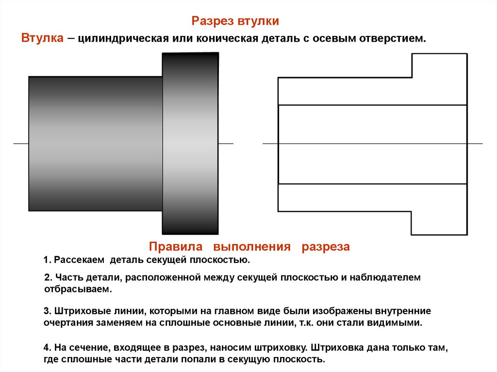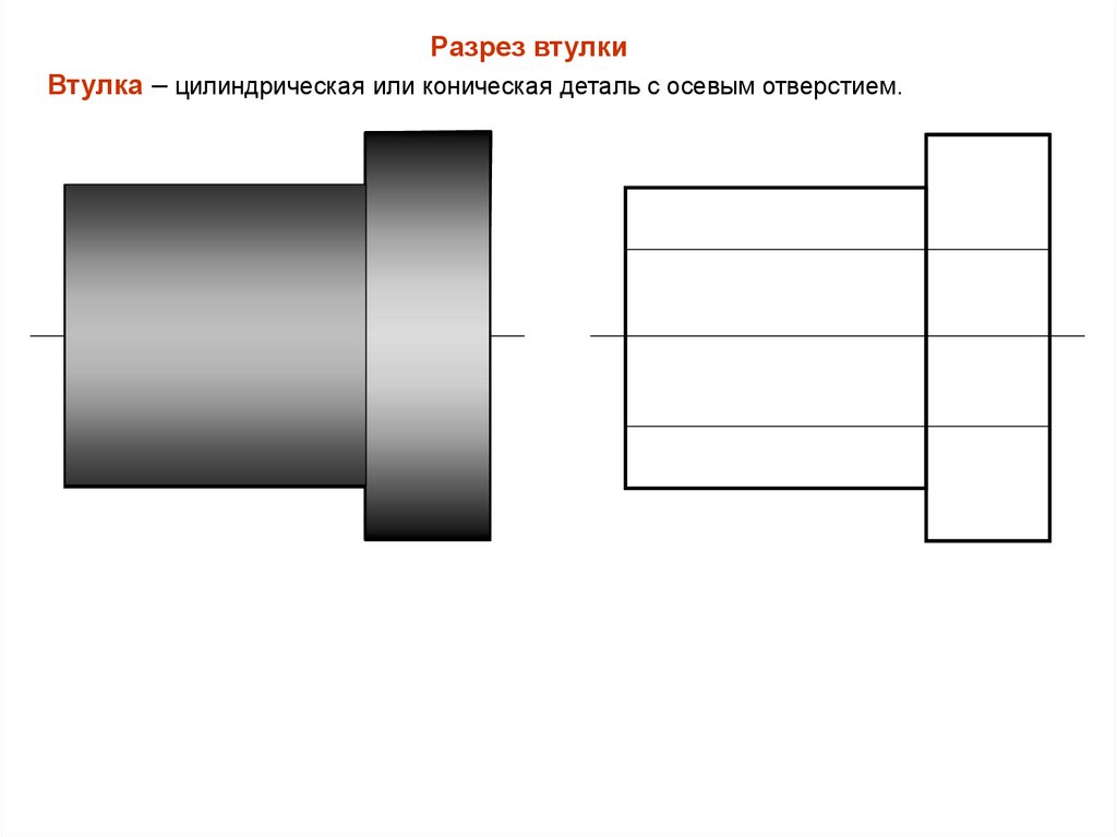 Разрез втулкиВтулка – цилиндрическая или коническая деталь с осевым отверстием.