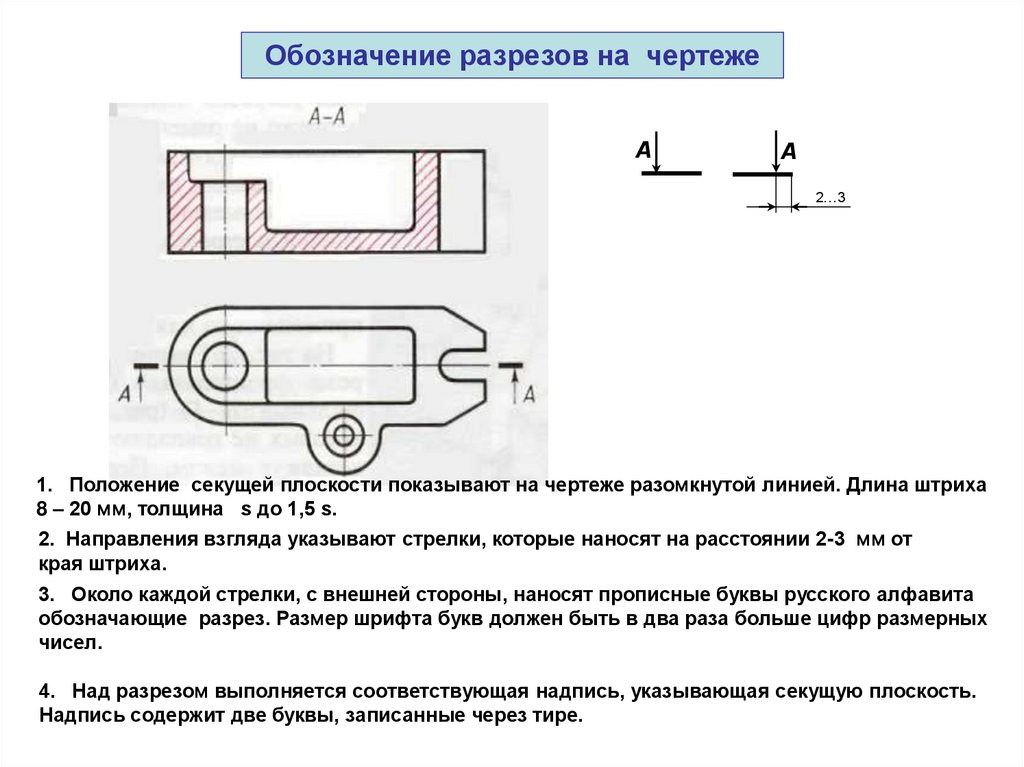 1. Положение секущей плоскости показывают на чертеже разомкнутой линией. Длина штриха