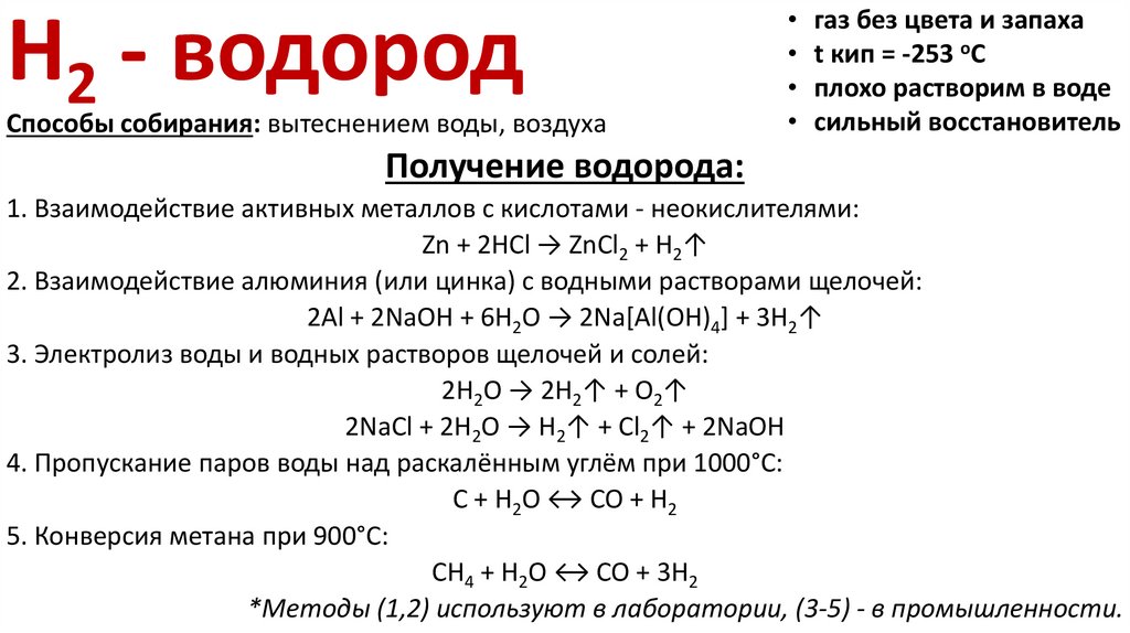 Н2 - водородСпособы собирания: вытеснением воды, воздуха