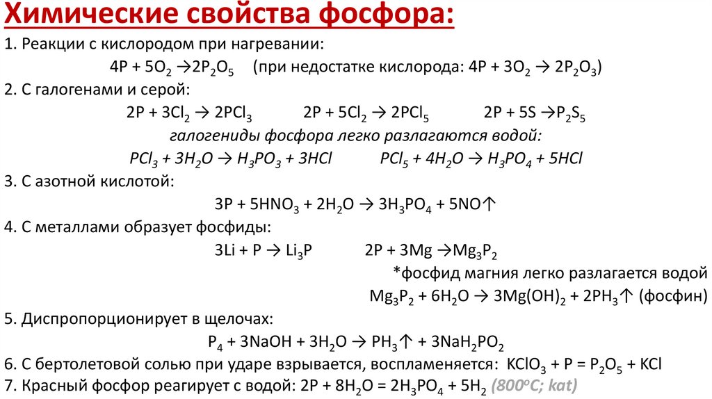 7. Красный фосфор реагирует с водой: 2P + 8H2O = 2H3PO4 + 5H2 (800oC; kat)