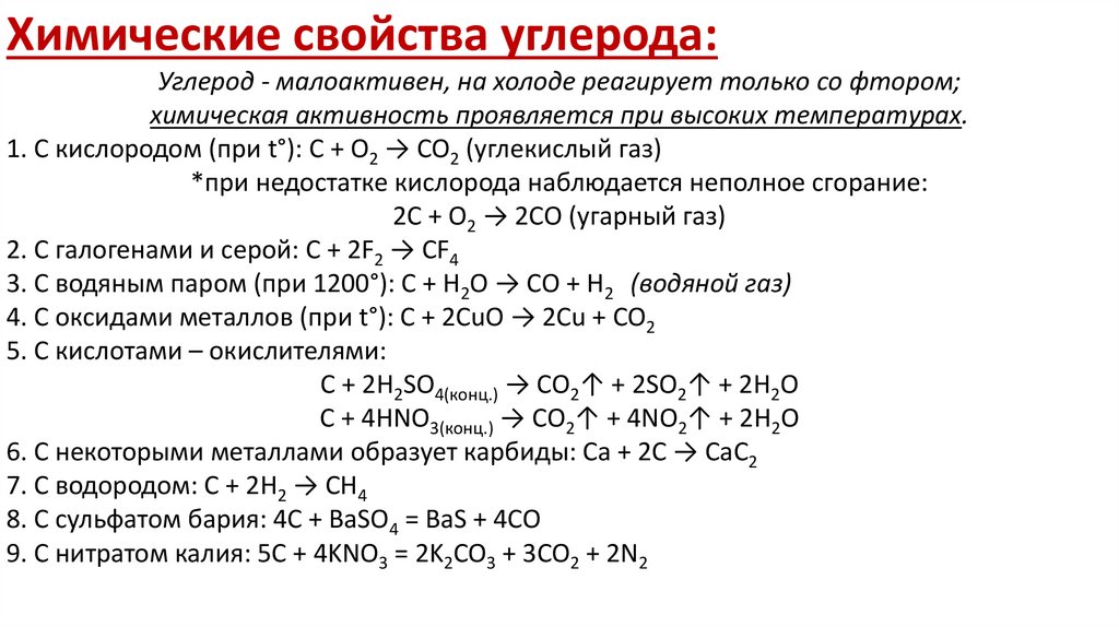 1. С кислородом (при t°): C + O2 → CO2 (углекислый газ)