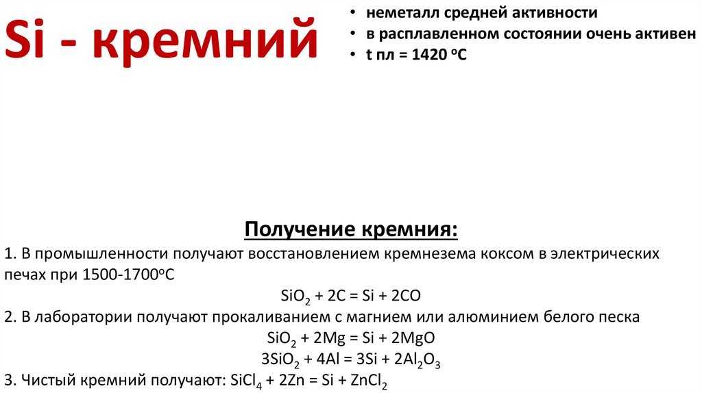 3. Чистый кремний получают: SiCl4 + 2Zn = Si + ZnCl2