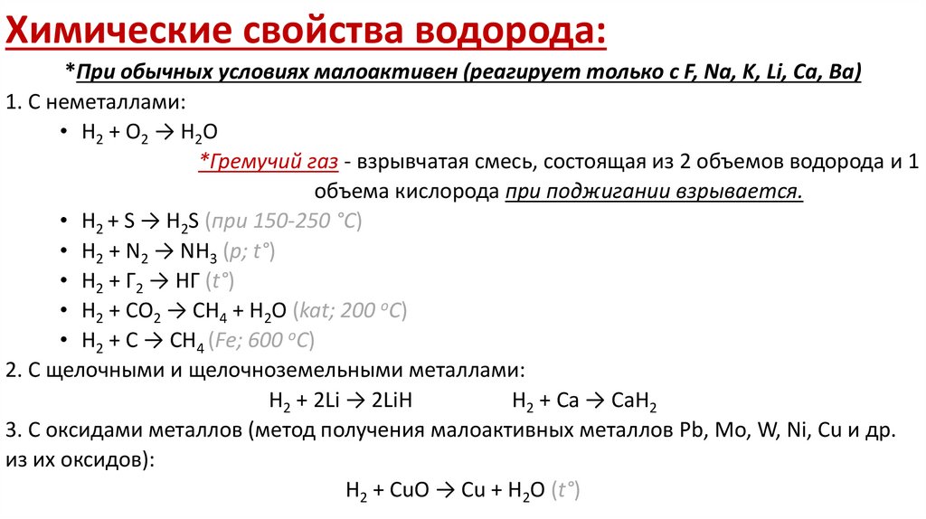 Химические свойства водорода:*При обычных условиях малоактивен (реагирует только с F, Na, K, Li, Ca, Ba)