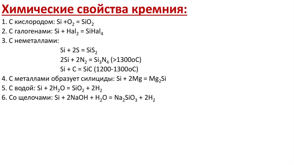 6. Cо щелочами: Si + 2NaOH + H2O = Na2SiO3 + 2H2