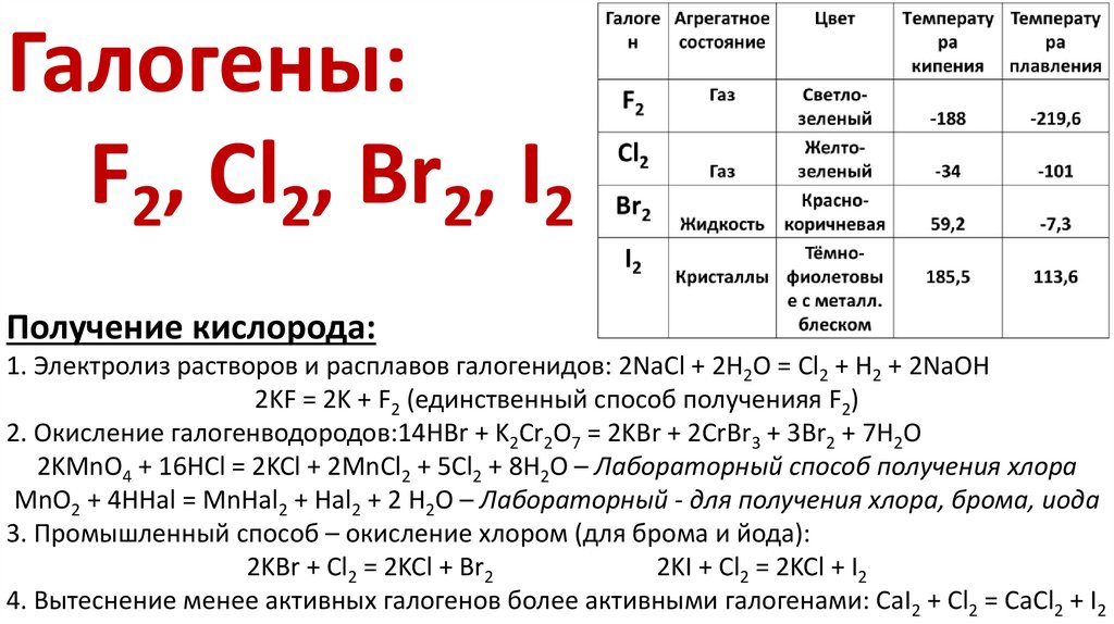 1. Электролиз растворов и расплавов галогенидов: 2NaCl + 2H2O = Cl2 + H2 + 2NaOH