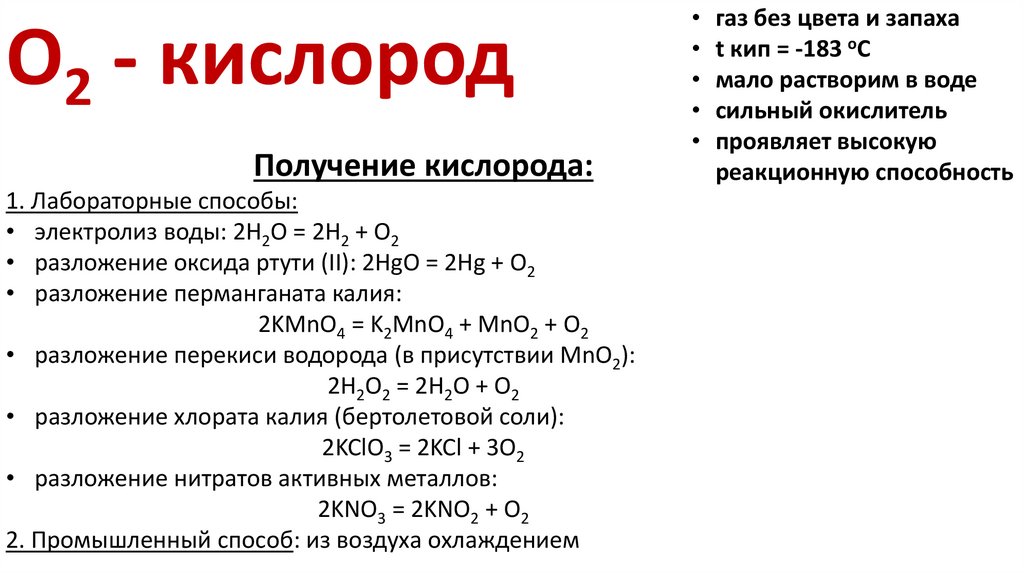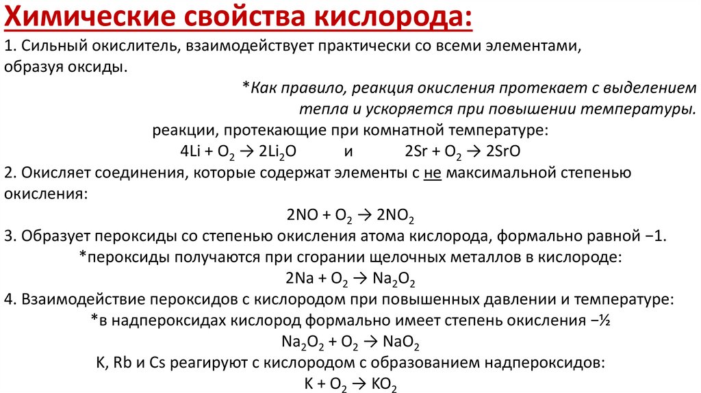 Химические свойства кислорода:1. Сильный окислитель, взаимодействует практически со всеми элементами,