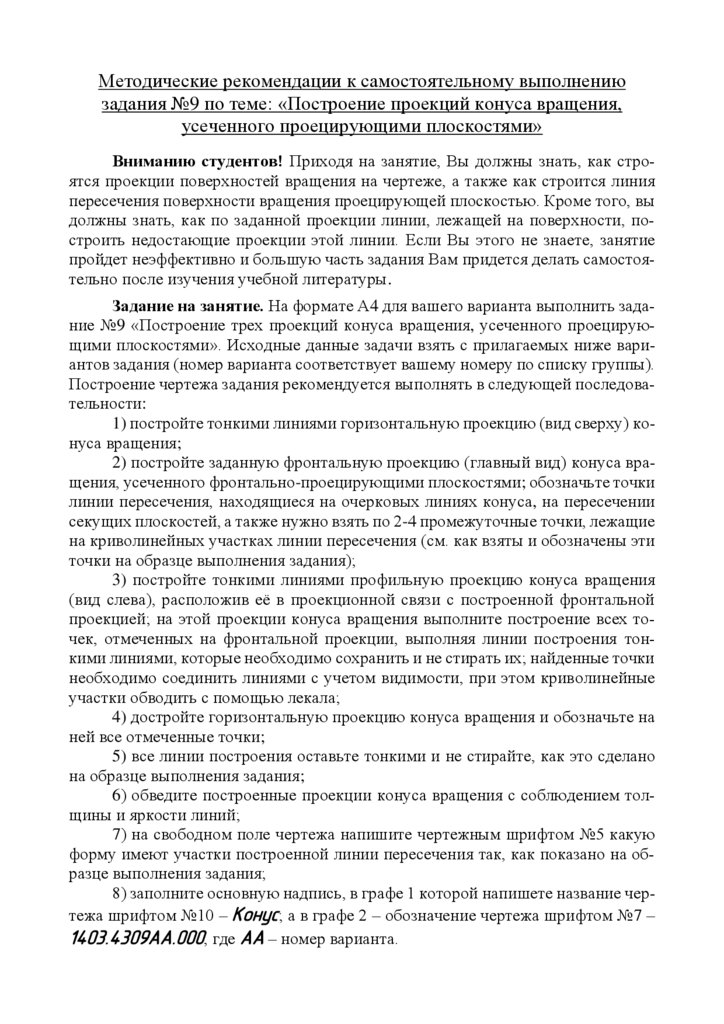Методические рекомендации к самостоятельному выполнениюзадания №9 по теме: «Построение проекций конуса вращения,