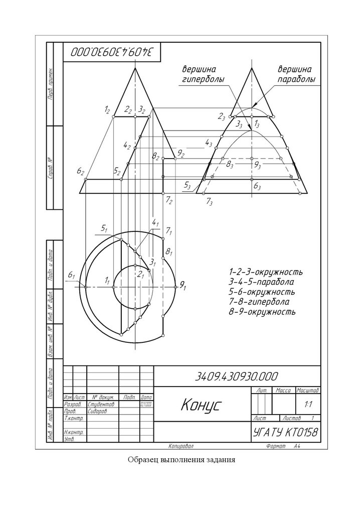 6) обведите построенные проекции конуса вращения с соблюдением толщины и яркости линий;