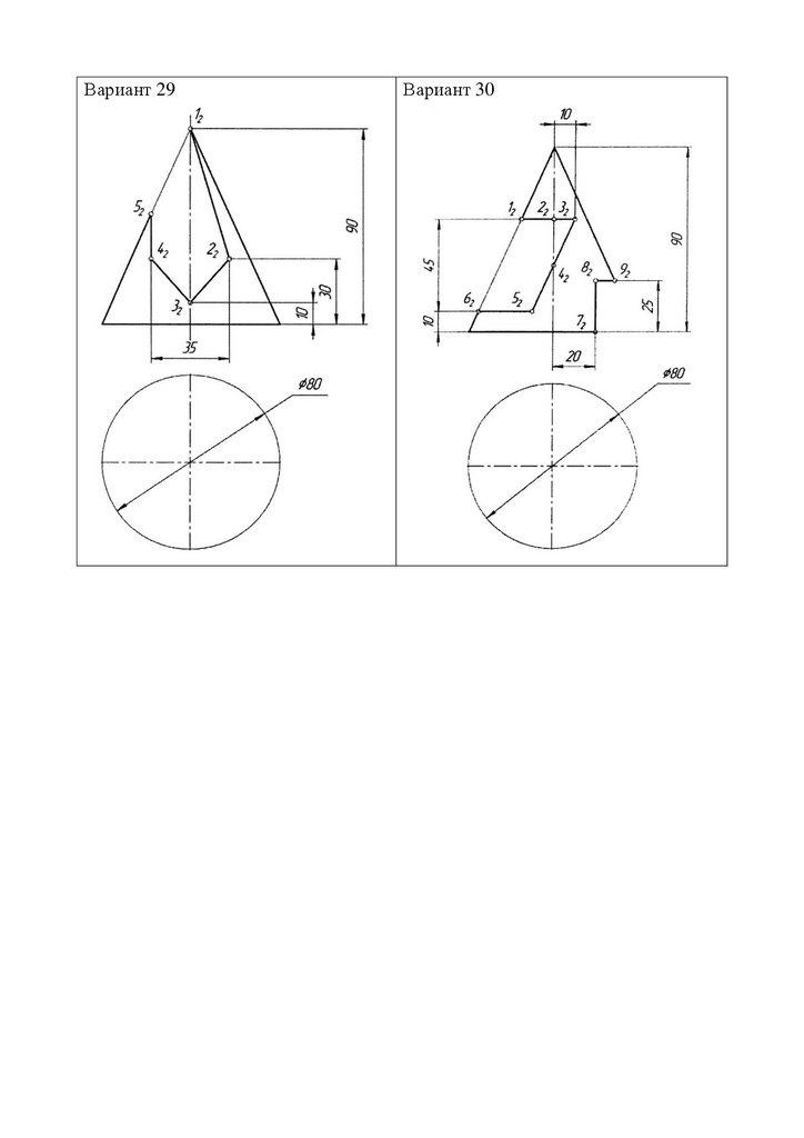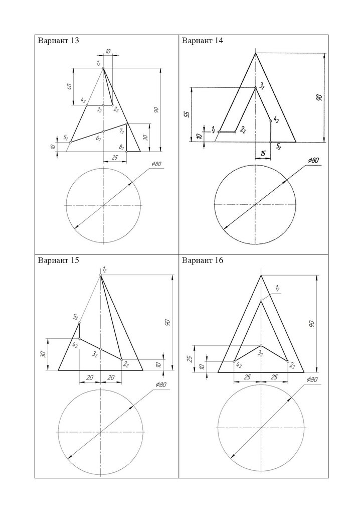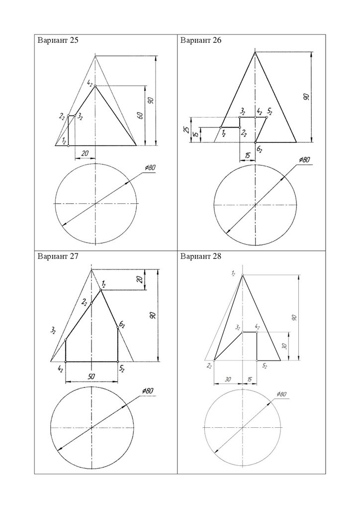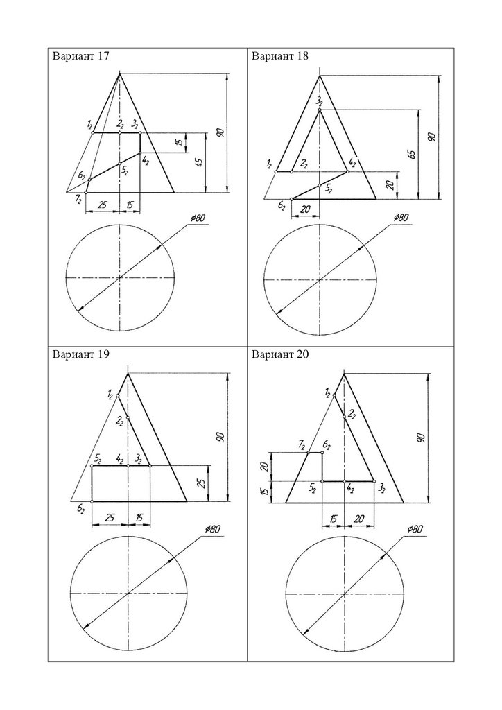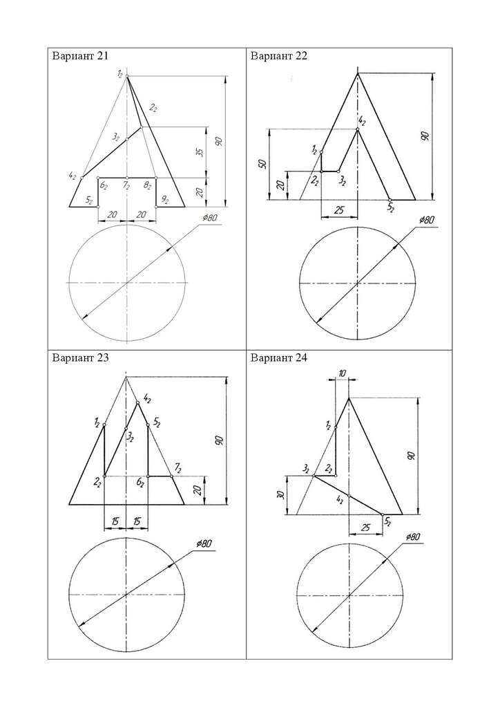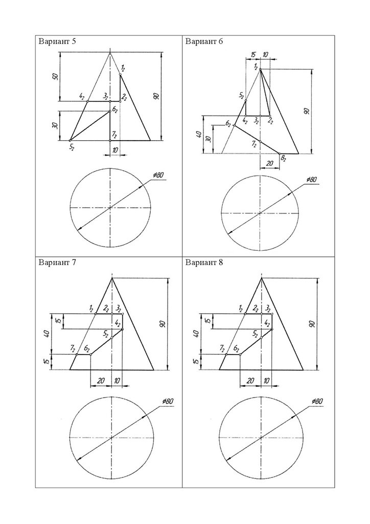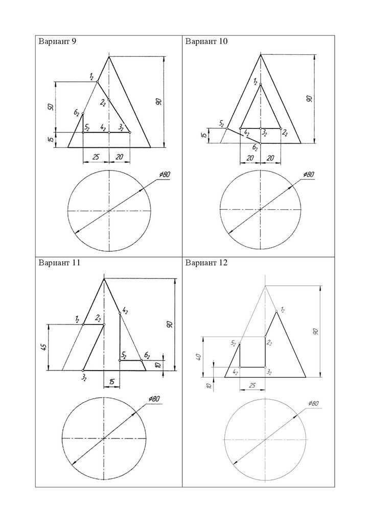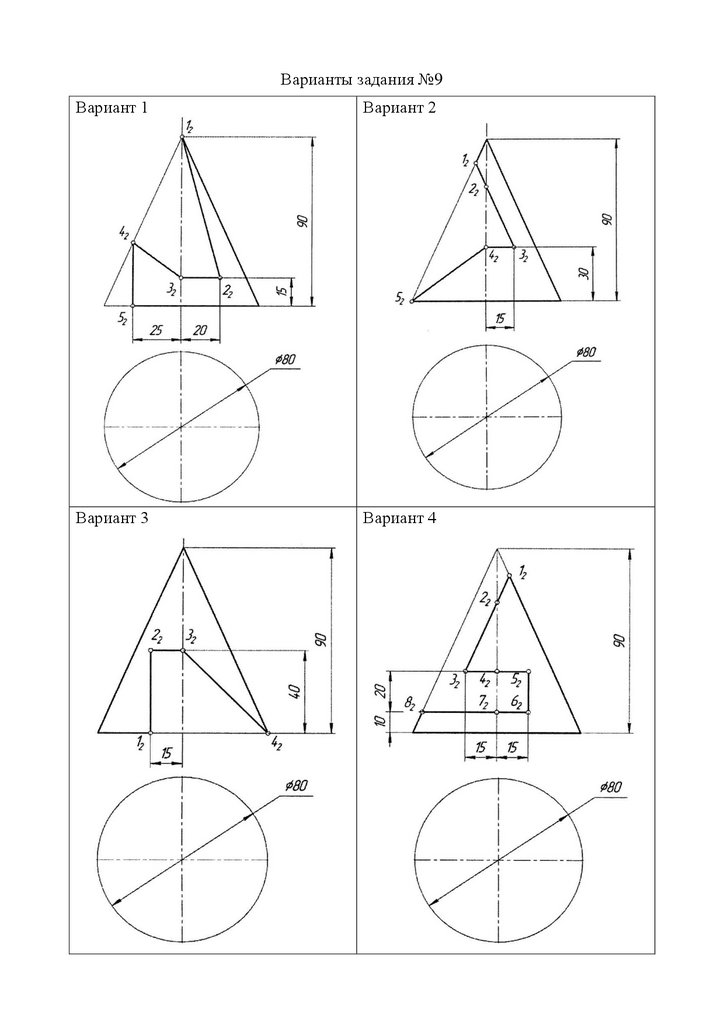 Задание на занятие. На формате А4 для вашего варианта выполнить задание №9 «Построение трех проекций конуса вращения, усеченного проецирующими плоскостями». Исходные данные задачи взять с прилагаемых ниже вариантов задания (номер варианта соответствует вашему номеру по списку группы).