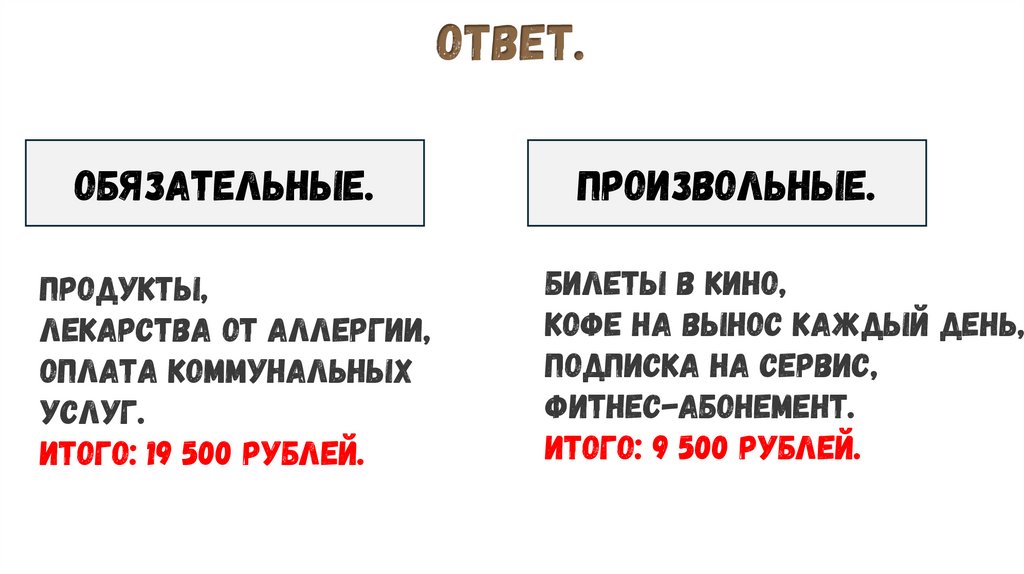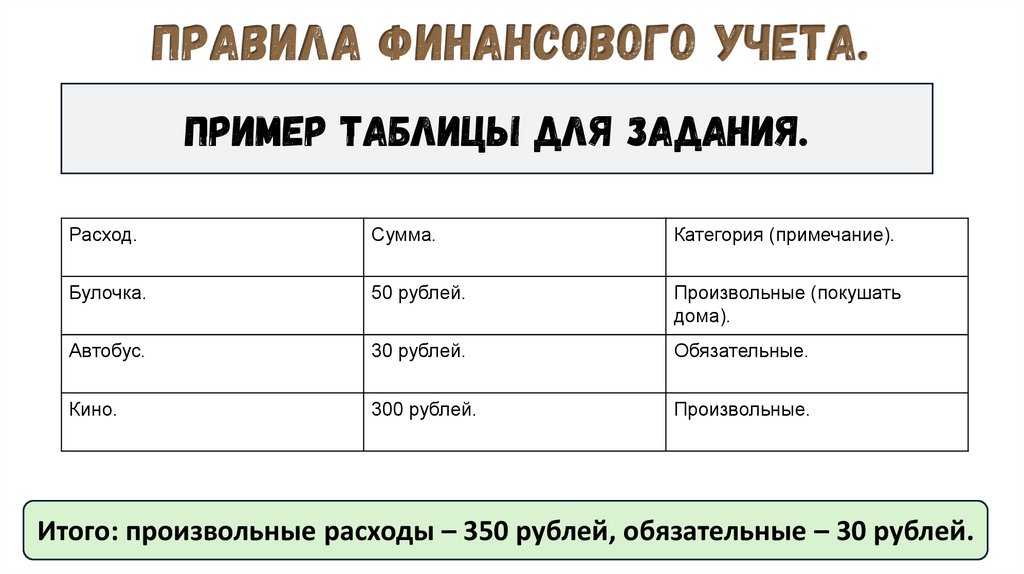 Итого: произвольные расходы – 350 рублей, обязательные – 30 рублей.