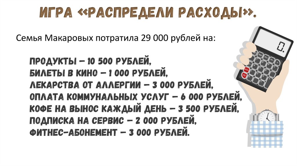 Игра «распредели расходы».Семья Макаровых потратила 29 000 рублей на: