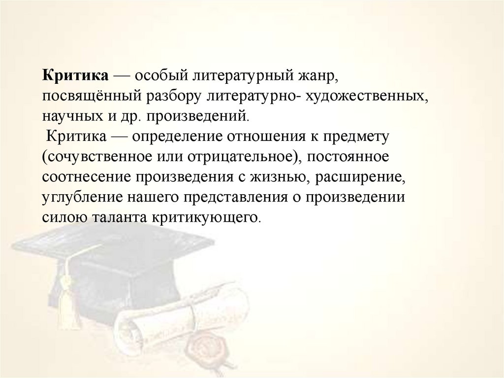 Критика — особый литературный жанр,посвящённый разбору литературно- художественных,