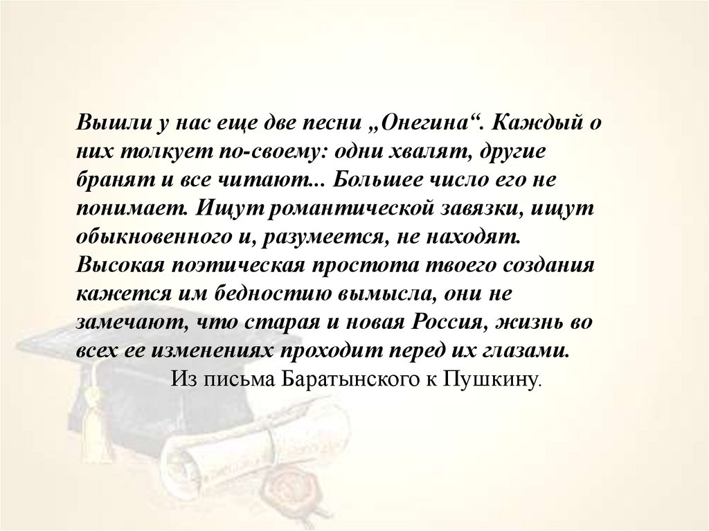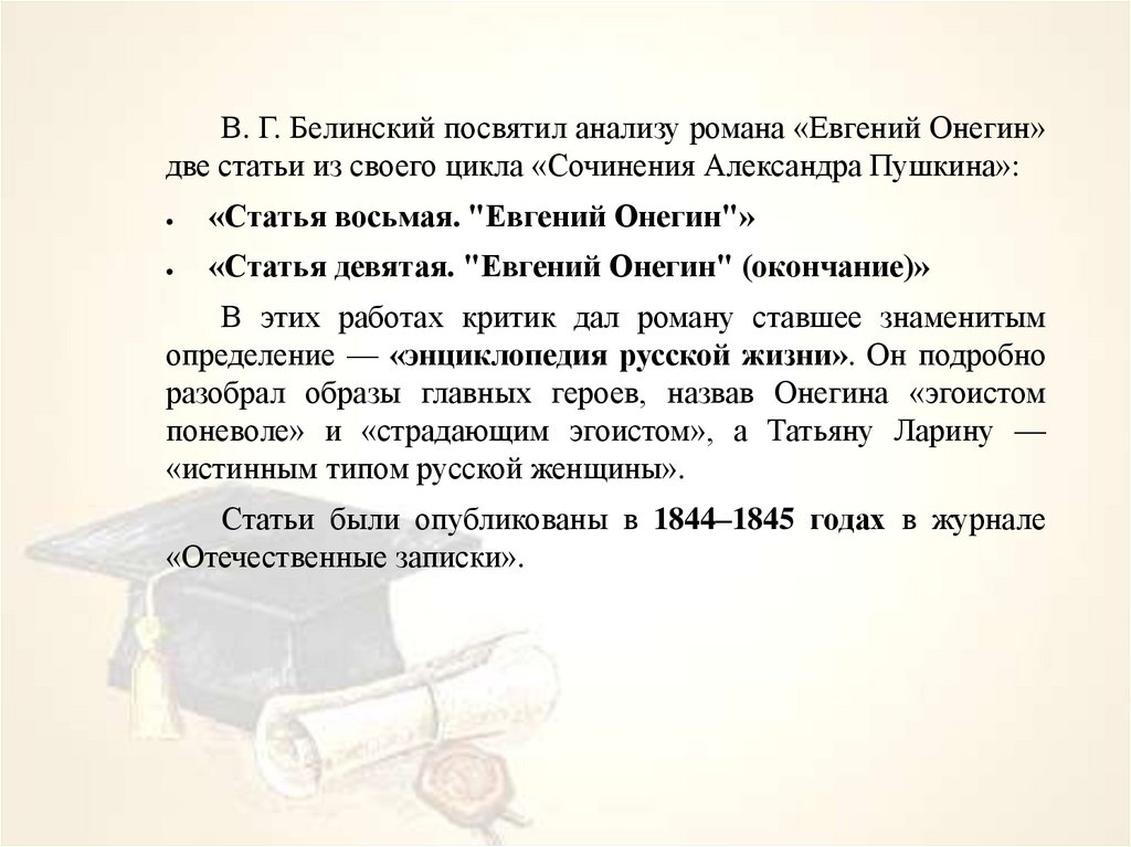 Кедров К. «Евгений Онегин» в системе образов мировой литературы/В мире Пушкина. М., 1В. Г. Белинский посвятил анализу романа «Евгений Онегин»