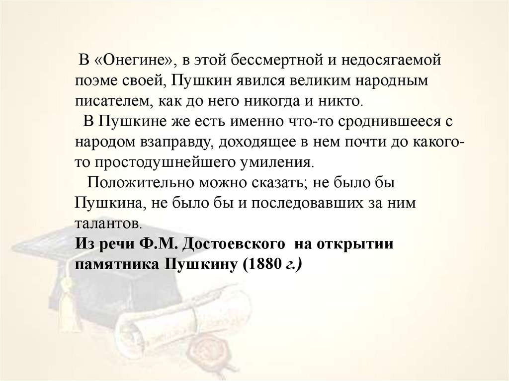 В «Онегине», в этой бессмертной и недосягаемойпоэме своей, Пушкин явился великим народным