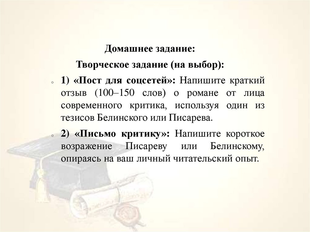 Домашнее задание:Творческое задание (на выбор):