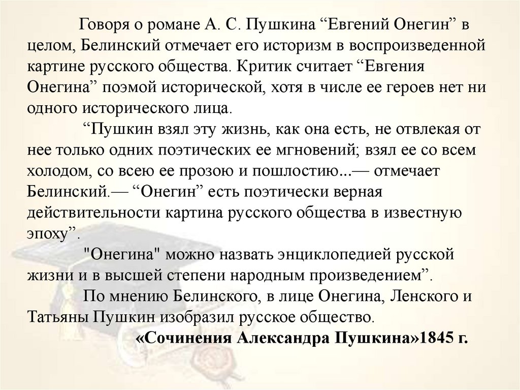 Говоря о романе А. С. Пушкина “Евгений Онегин” вцелом, Белинский отмечает его историзм в воспроизведенной