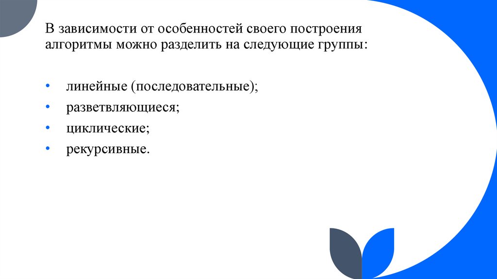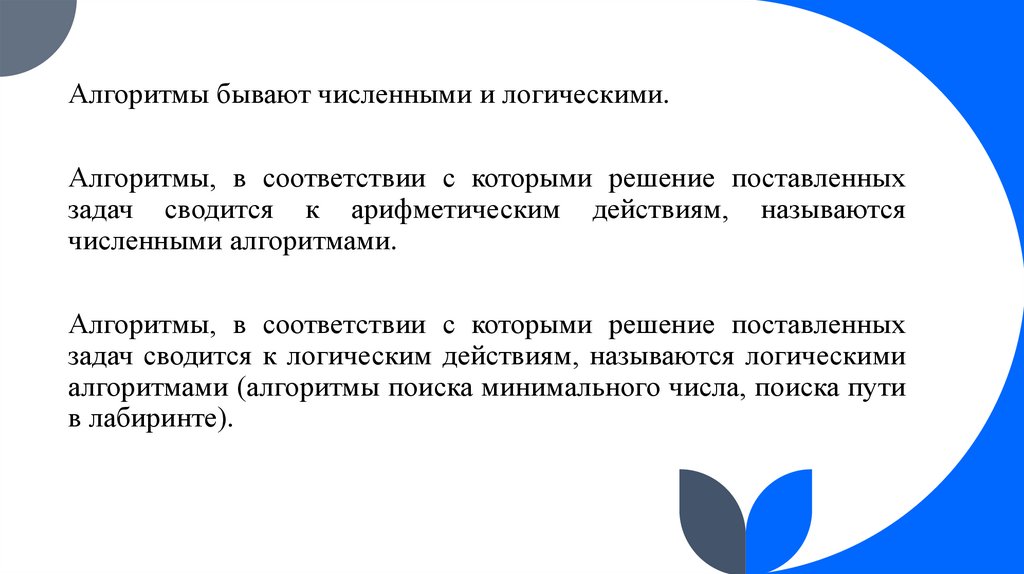 Алгоритмы бывают численными и логическими.Алгоритмы, в соответствии с которыми решение поставленных