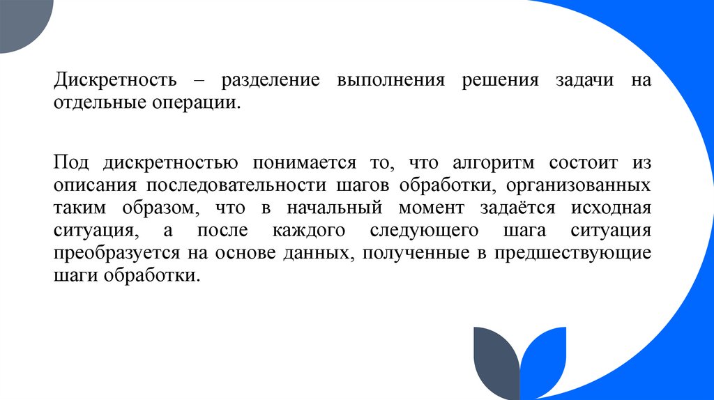 Дискретность – разделение выполнения решения задачи наотдельные операции.