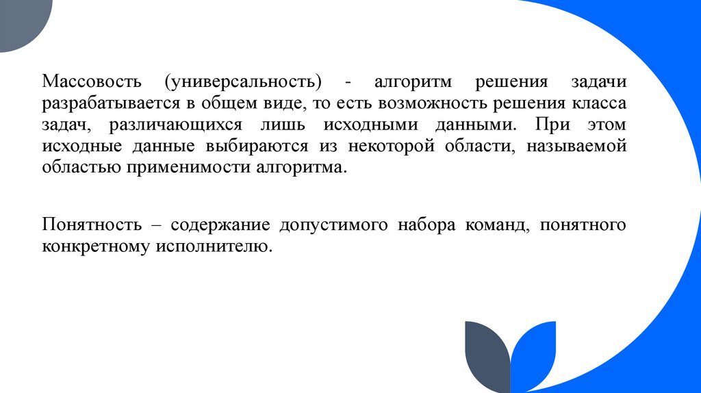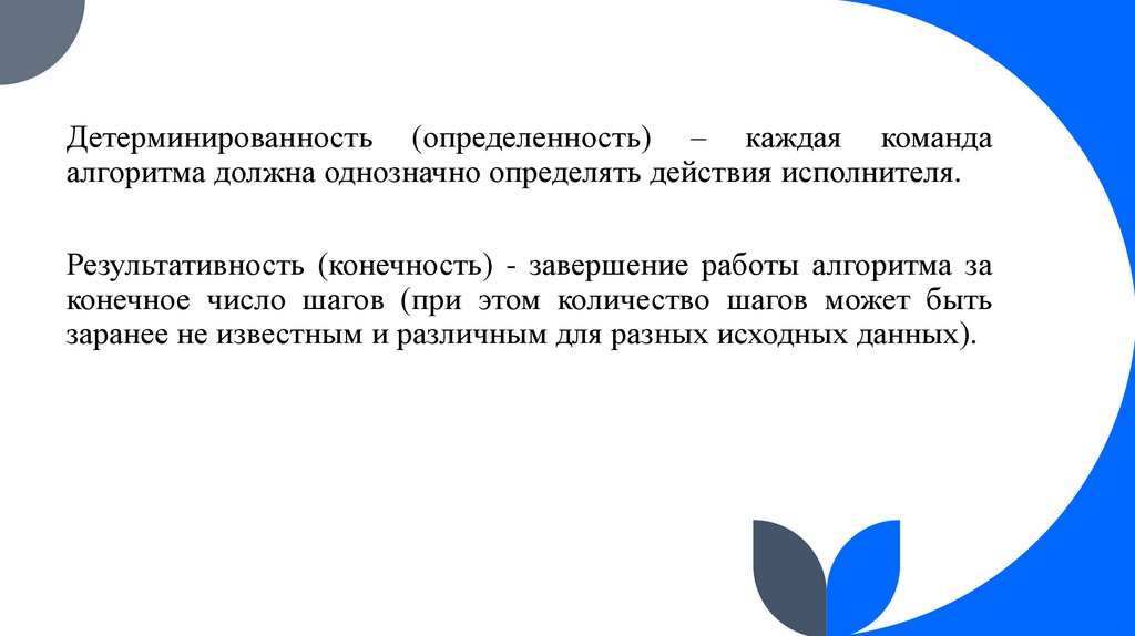 Детерминированность (определенность) – каждая командаалгоритма должна однозначно определять действия исполнителя.