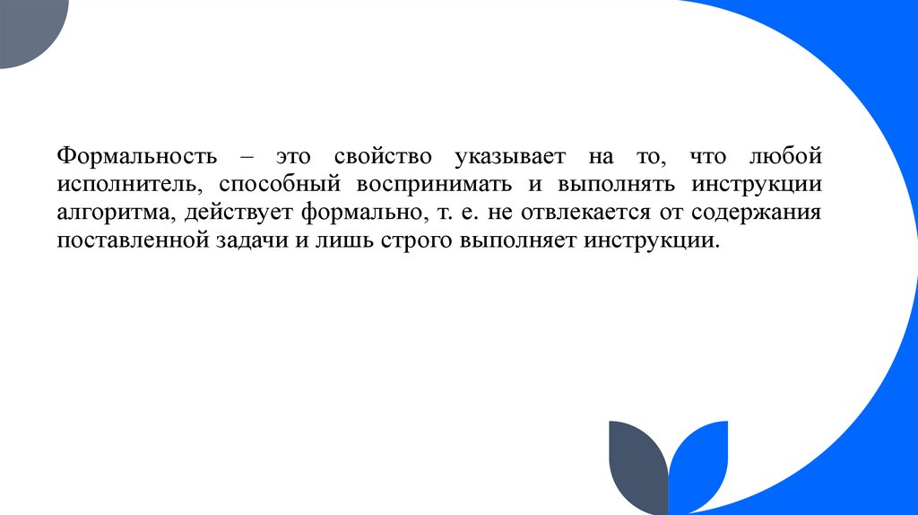 Формальность – это свойство указывает на то, что любойисполнитель, способный воспринимать и выполнять инструкции