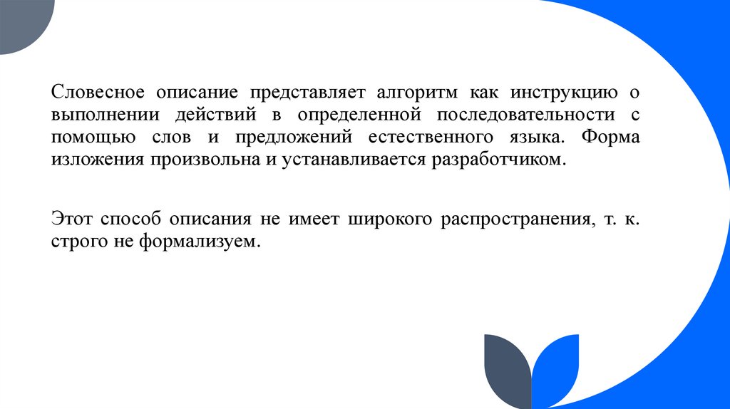 Словесное описание представляет алгоритм как инструкцию овыполнении действий в определенной последовательности с
