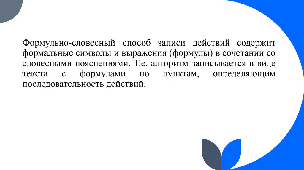 Формульно-словесный способ записи действий содержитформальные символы и выражения (формулы) в сочетании со