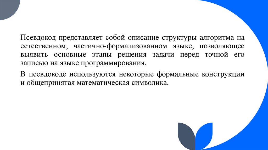 Псевдокод представляет собой описание структуры алгоритма наестественном, частично-формализованном языке, позволяющее