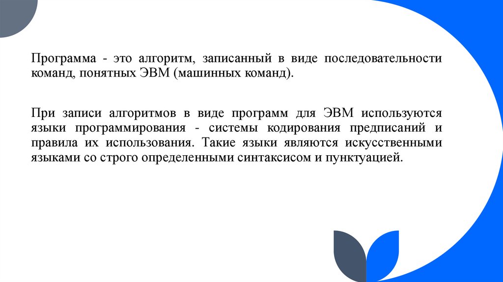 Программа - это алгоритм, записанный в виде последовательностикоманд, понятных ЭВМ (машинных команд).