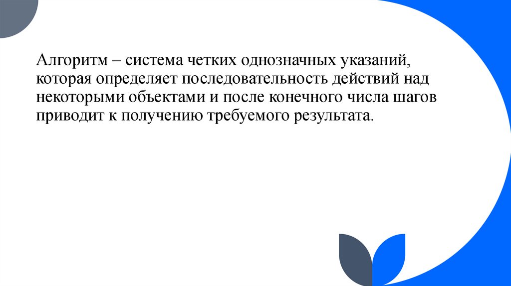 Алгоритм – система четких однозначных указаний,которая определяет последовательность действий над