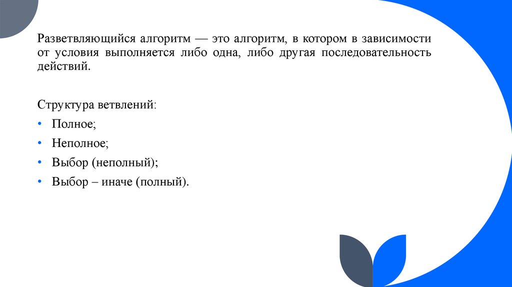 Разветвляющийся алгоритм — это алгоритм, в котором в зависимостиот условия выполняется либо одна, либо другая последовательность